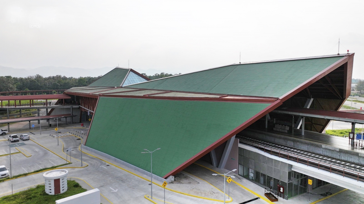 El edificio de la estación se levanta de su entorno natural como una gran cubierta en puente sobre cuatro apoyos, librando los diferentes niveles topográficos y dando protección generosa bajo su cuerpo. Con su elaboración simétrica, sus superficies facetadas, y sus tonos verdes, recuerda la máscara funeraria de Pakal “el Grande”, quien llevó a Palenque a un gran esplendor durante el período Clásico Maya. En la actualidad, la máscara de jade es uno de los tesoros más reconocidos del Museo de Antropología en Ciudad de México.