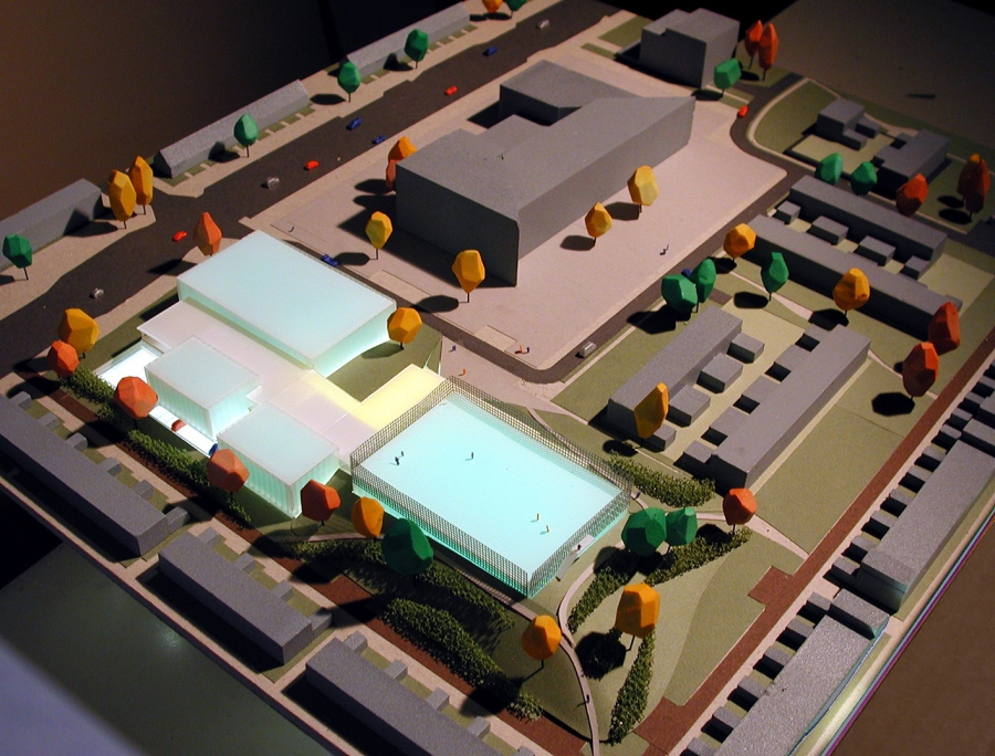 Ubicado en las afueras de la ciudad de Amsterdam, el Caland Sportscentrum es un conjunto 6 salas de deportes diferentes, una cafetería, espacios para ejercicios y fitness, estacionamiento y otras facilidades. Es un centro deportivo que sirve para el Colegio Caland pero también para organizaciones comunitarias. El diseño refleja una composición de las volúmenes de tal manera que se dejan patios verdes entre ellos, dando un imagen de diversidad y paisaje. Este sentido se conserva en el interior, donde los usuarios pueden acceder a todas las funciones a través de varias rutas. Se mantiene el sentido verde del terreno y se usa el techo de la gran sala como un espacio público.
