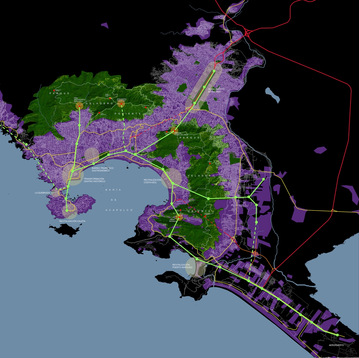 Como parte del Concurso de Ideas para Acapulco después del huracán Otis, se propuso un sistema de teleféricos que conectan las colonias periféricas con el centro de la ciudad y a través de la bahía hasta la zona Diamante. El objetivo es llegar a una ciudad más integrada y participativa y menos congestionada por tráfico vehicular. Al mismo tiempo es un proyecto de reordenación urbana al nivel más local. En tres ubicaciones específicas presentamos unas propuestas de restructuración de perfiles de calles y mejoría del imagen urbano. Estamos de la convicción que hay que mejorar las desgastadas pero llamativas zonas céntricas de Acapulco para ayudar a la gente local y diversificar las oportunidades para el turismo.
