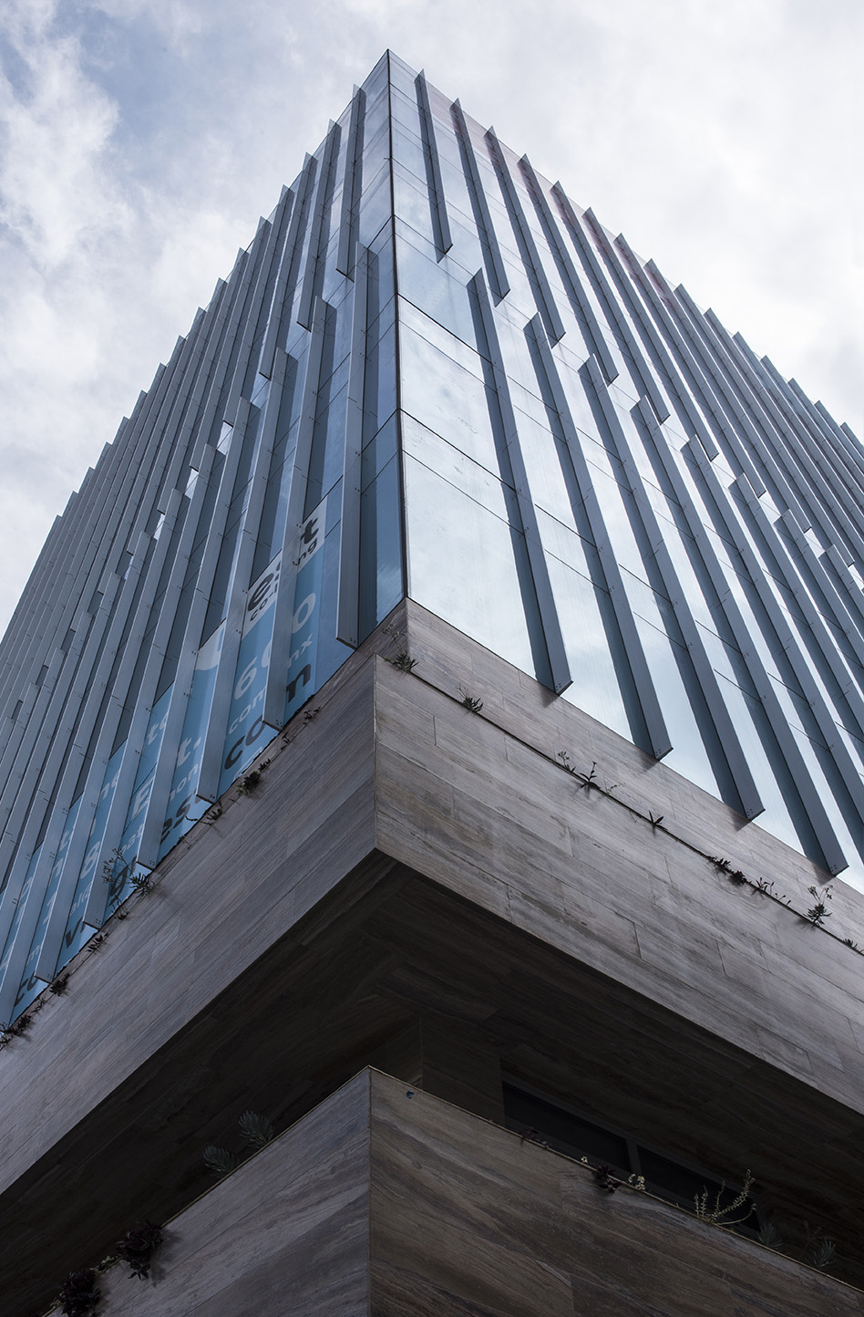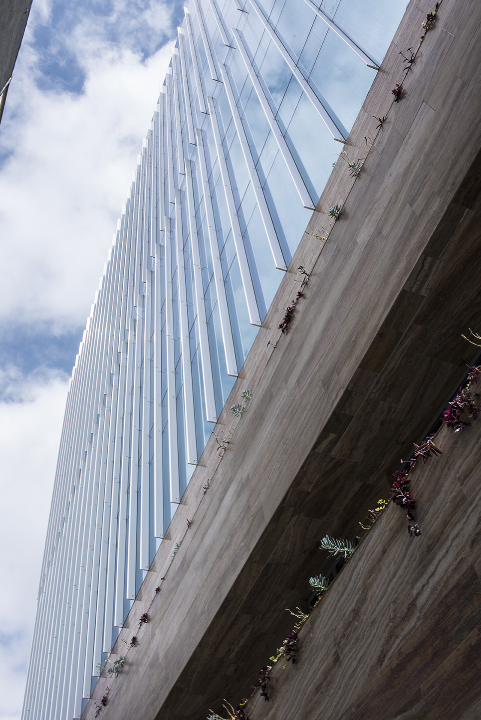 La torre expresa su verticalidad y ligereza en el gesto desfasado de la cancelería. Las diferencias programáticas se expresan aún más por la presencia de las bandas habitacionales con balcones residenciales en niveles inferiores.